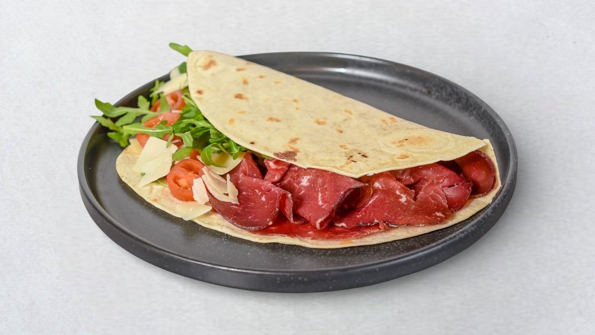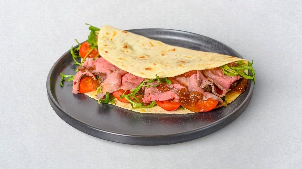 Pečena junetina, kremasta salsa od četiri vrsta sira, slatki karamelizirani luk, svježa rukola i cherry rajčice.