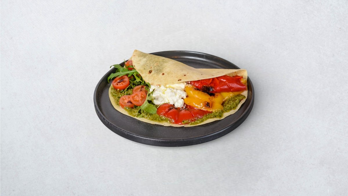 Kremasta burrata, pečena paprika, pesto genovese, svježa rukola, cherry rajčice i balsamico krema.