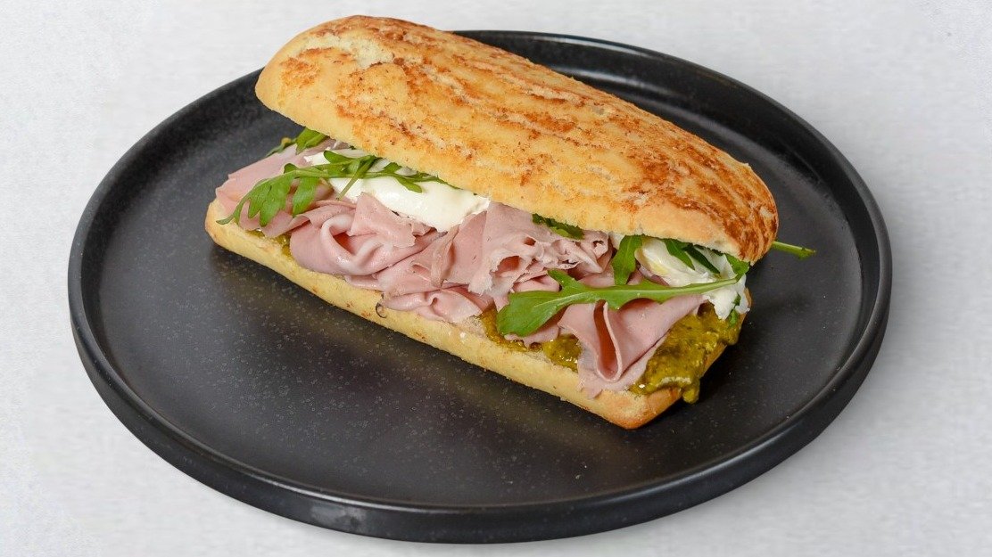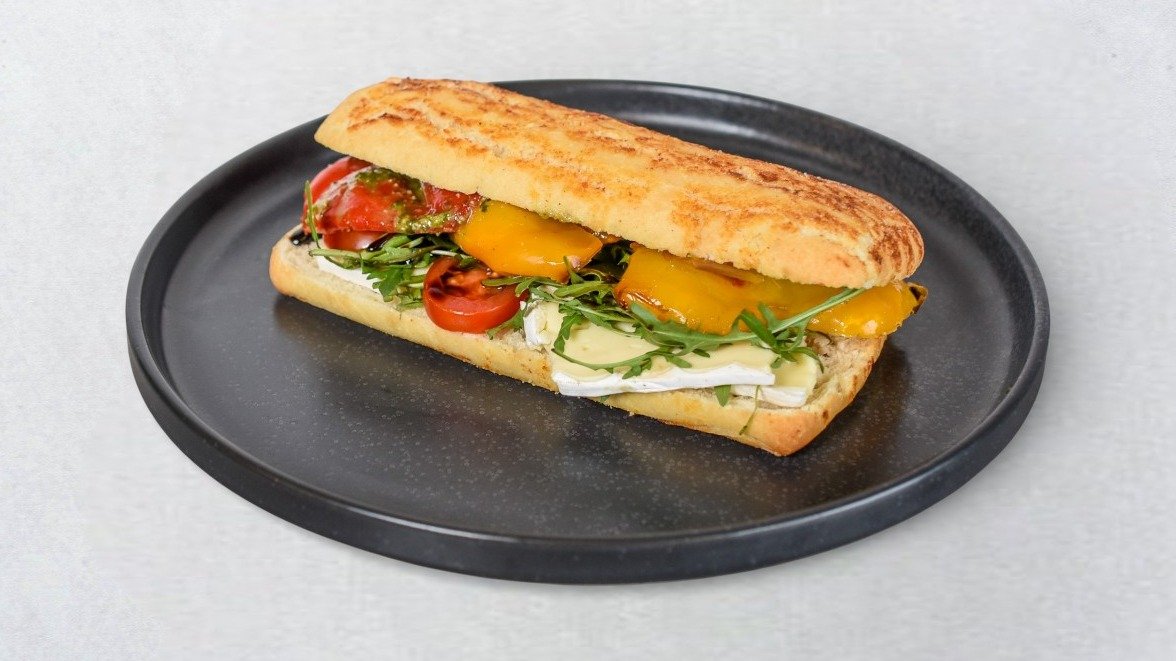 Hrskava ciabatta, kremasti brie sir, pečena paprika, pesto genovese, svježa rukola, cherry rajčice i balsamico krema.