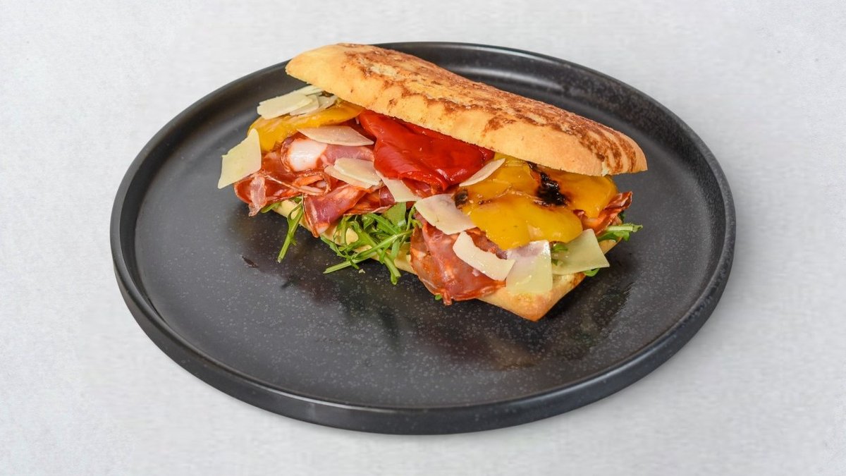 Hrskava ciabatta, pikantna kalabrijska salama, zreli grana padano, pečena paprika i svježa rukola.