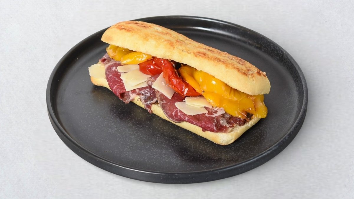 Hrskava ciabatta, dimljena Black Angus govedina, kremasta salsa od četiri vrste sira, zreli grana padano, pečena paprika i slatki karamelizirani luk.