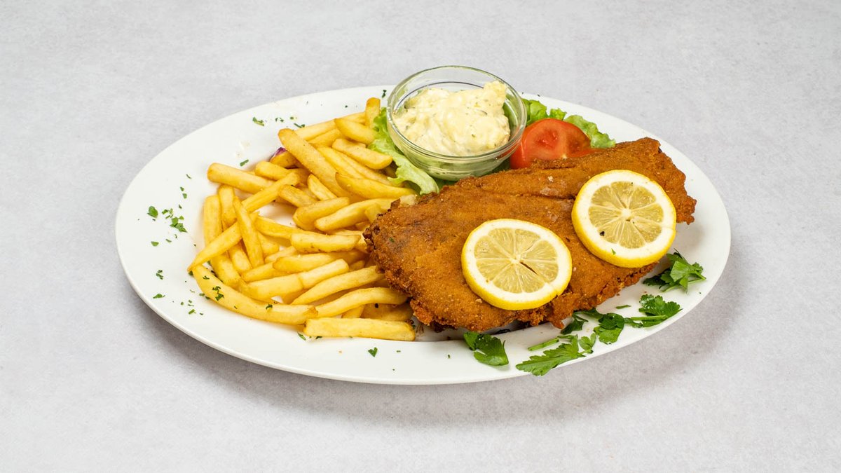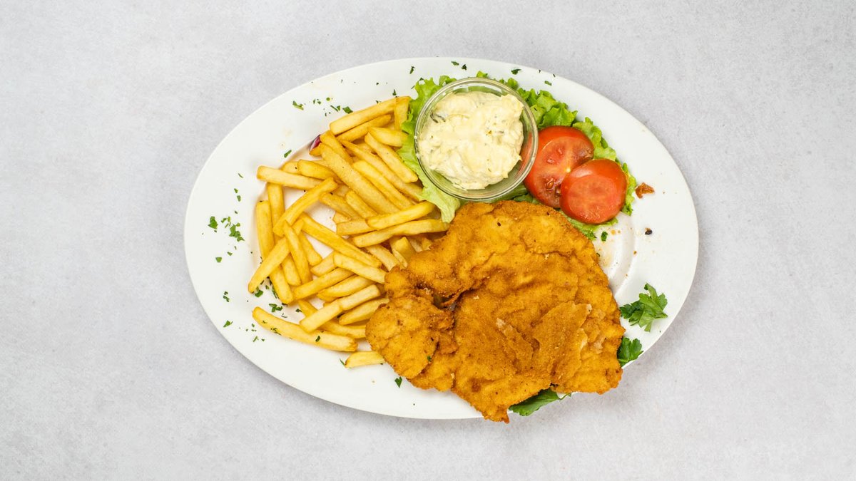 Pileći bečki odrezak 300g, prženi krumpirići, tartar, kruh nije uključen u cijenu *slika je simbolična
