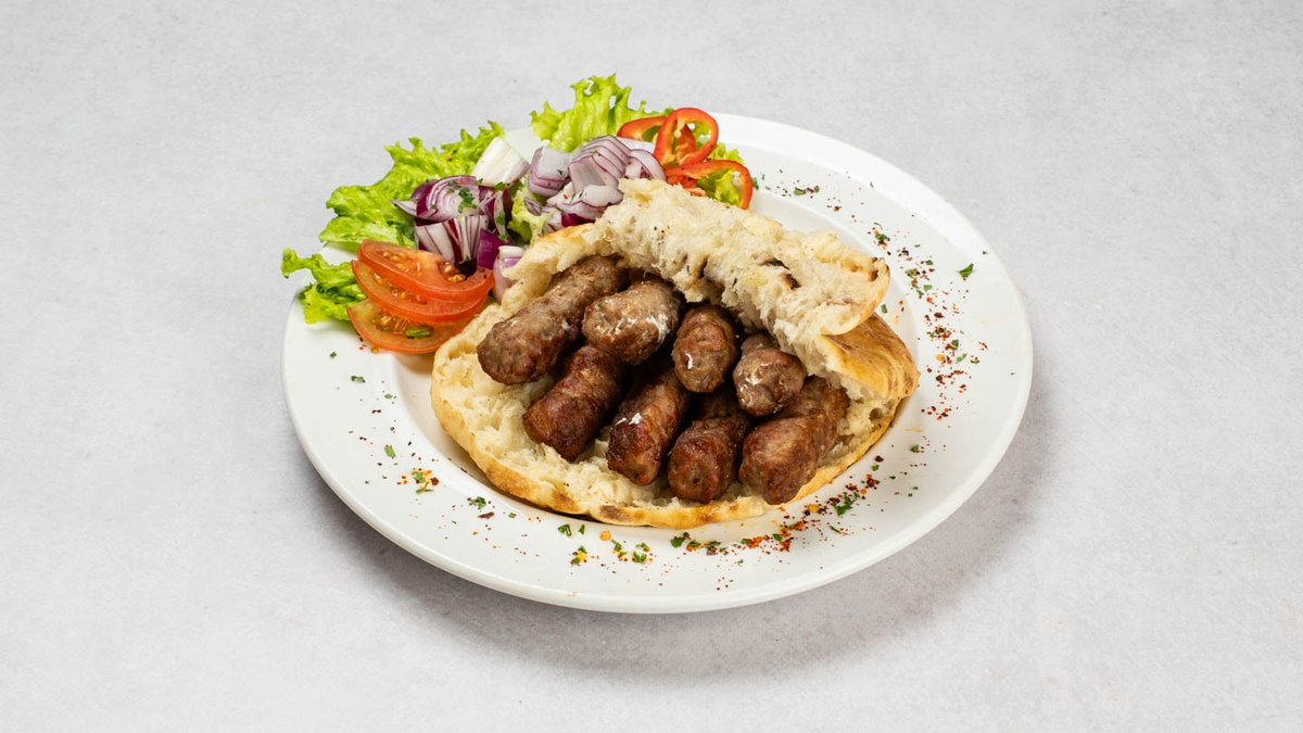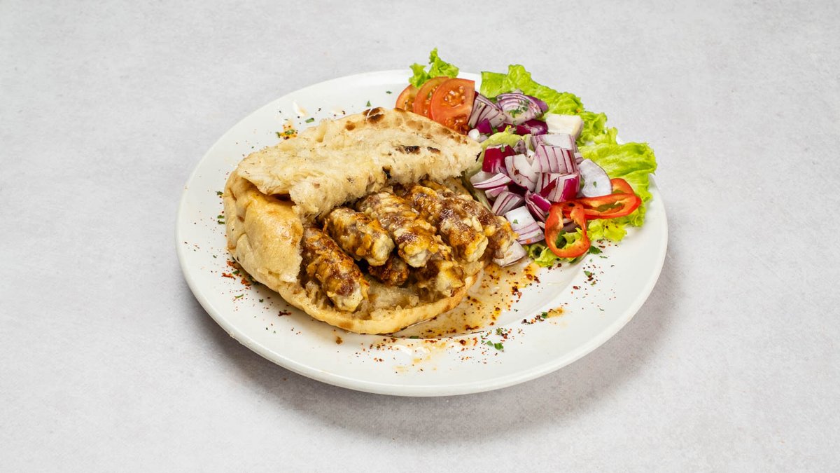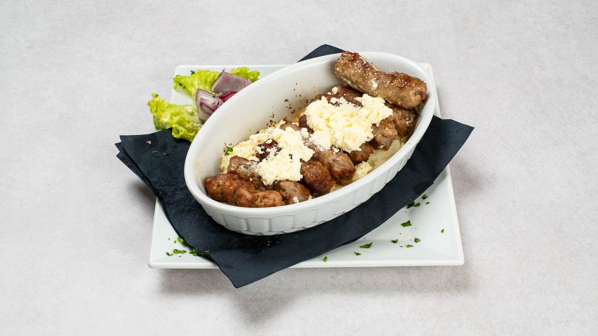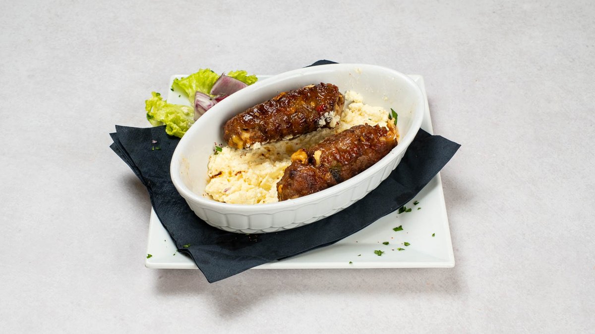2x šiš ćevap punjeni sa sirom i pancetom s kajmakom 300g, lepinja *slika je simbolična