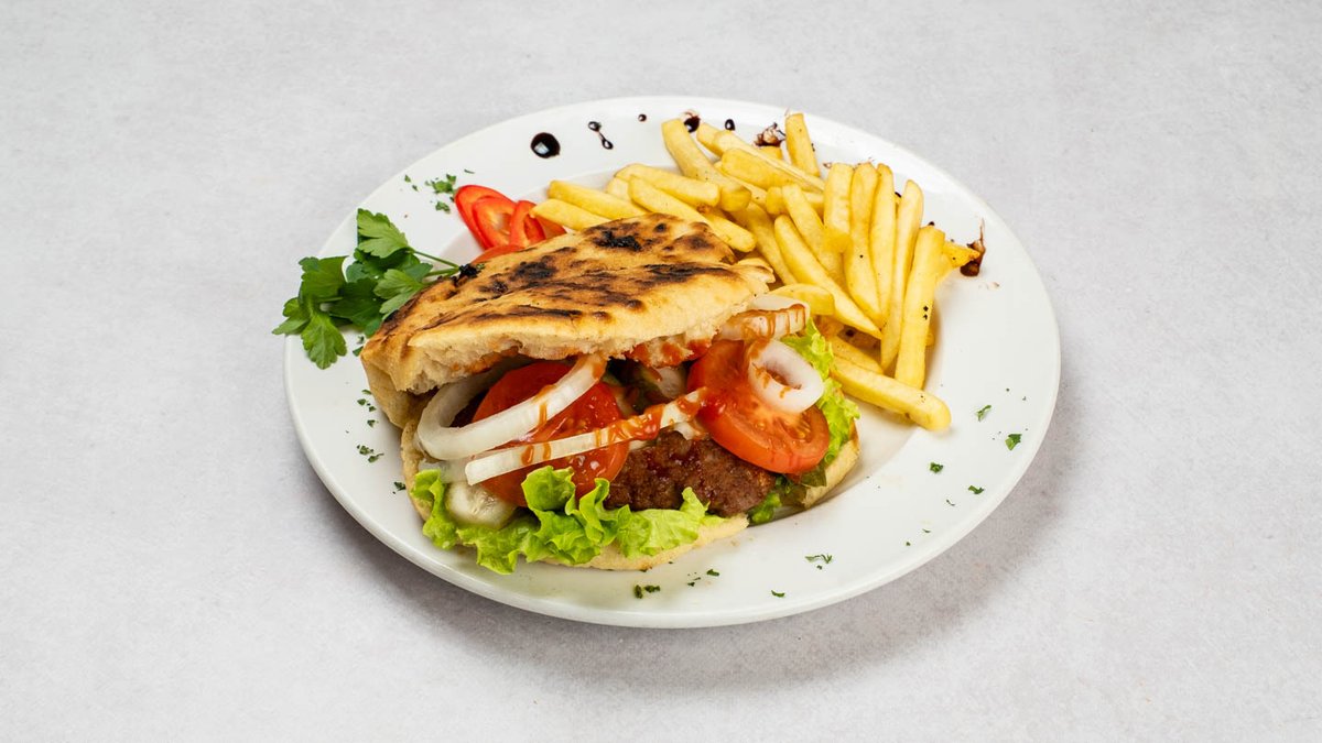 Lepinja, pljeskavica 250g, topljeni sir, buđola, rajčica, luk, zelena salata, kiseli krastavci, ketchup, prženi krumpirići *slika je simbolična