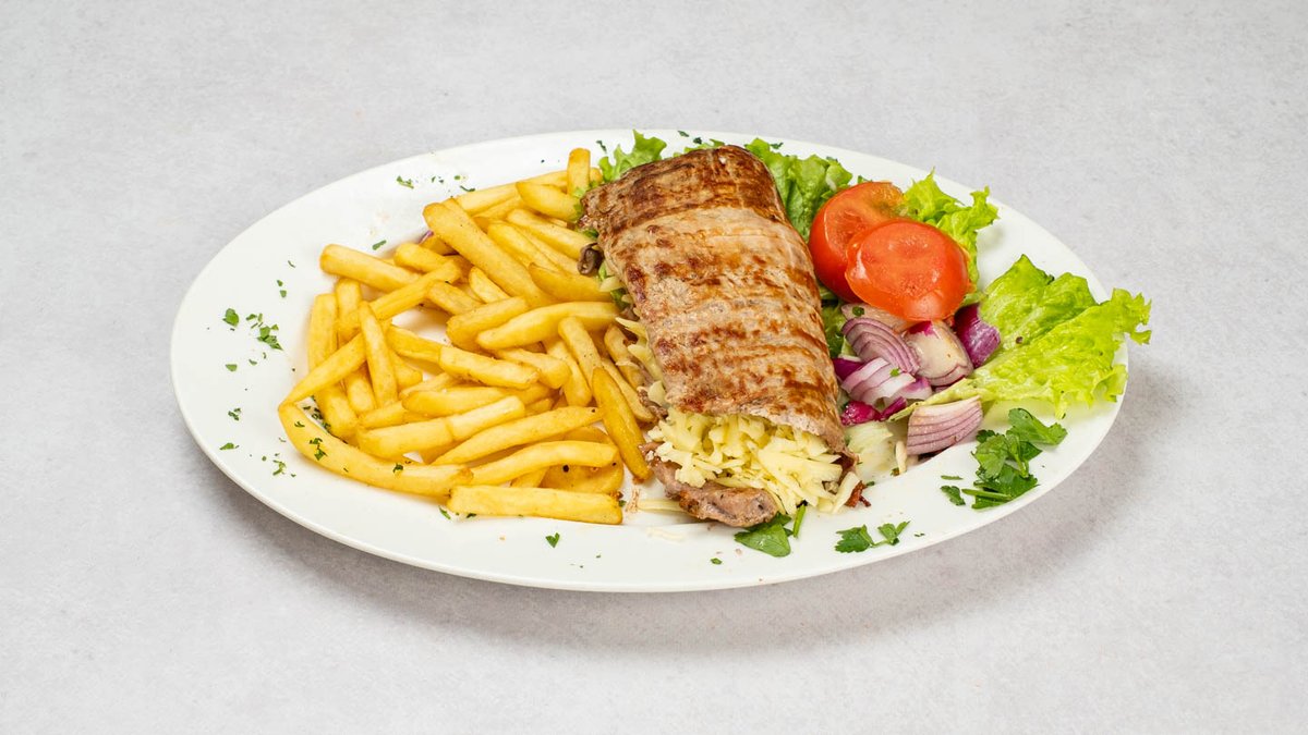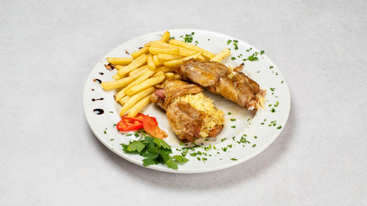 Punjeni lungić sa sirom i dimljenom šunkom 450g, prženi krumpirići *slika je simbolična