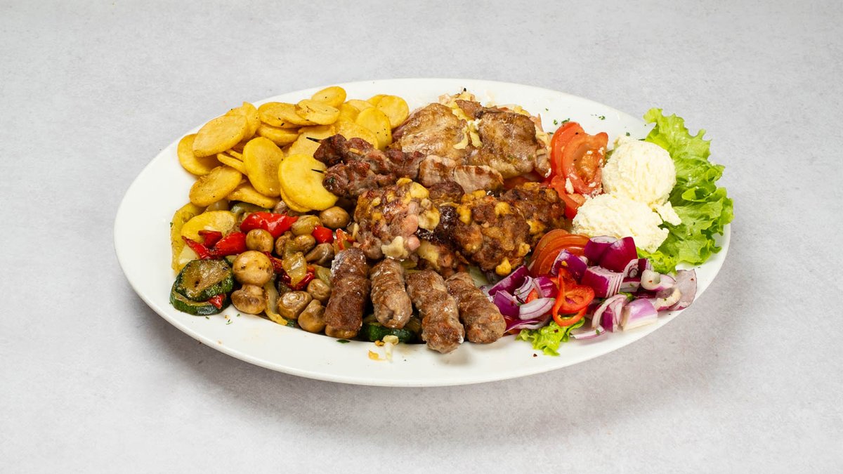 4x ćevap, 4x ćevap sa sirom, 4x mesni uštipak, pljeskavica Bartol Kašić, punjeni pileći batak zabatak, šišćevap "Tomislav", police od krumpira, povrće wok, kajmak, lepinje *slika je simbolična