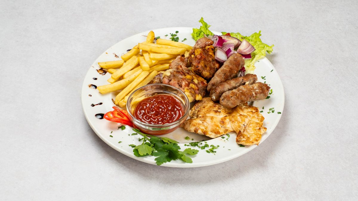 3 ćevapa, 2 mesna uštipka, ražnjić, svinjski kotlet, prženi krumpirići, lepinja, ketchup *slika je simbolična