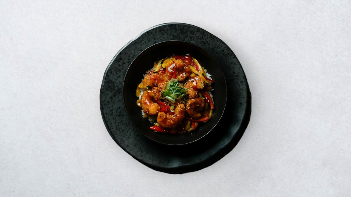 Riža, kozice u ljutkastom umaku od chilija, paprike i đumbira, mladi luk, sezam mix