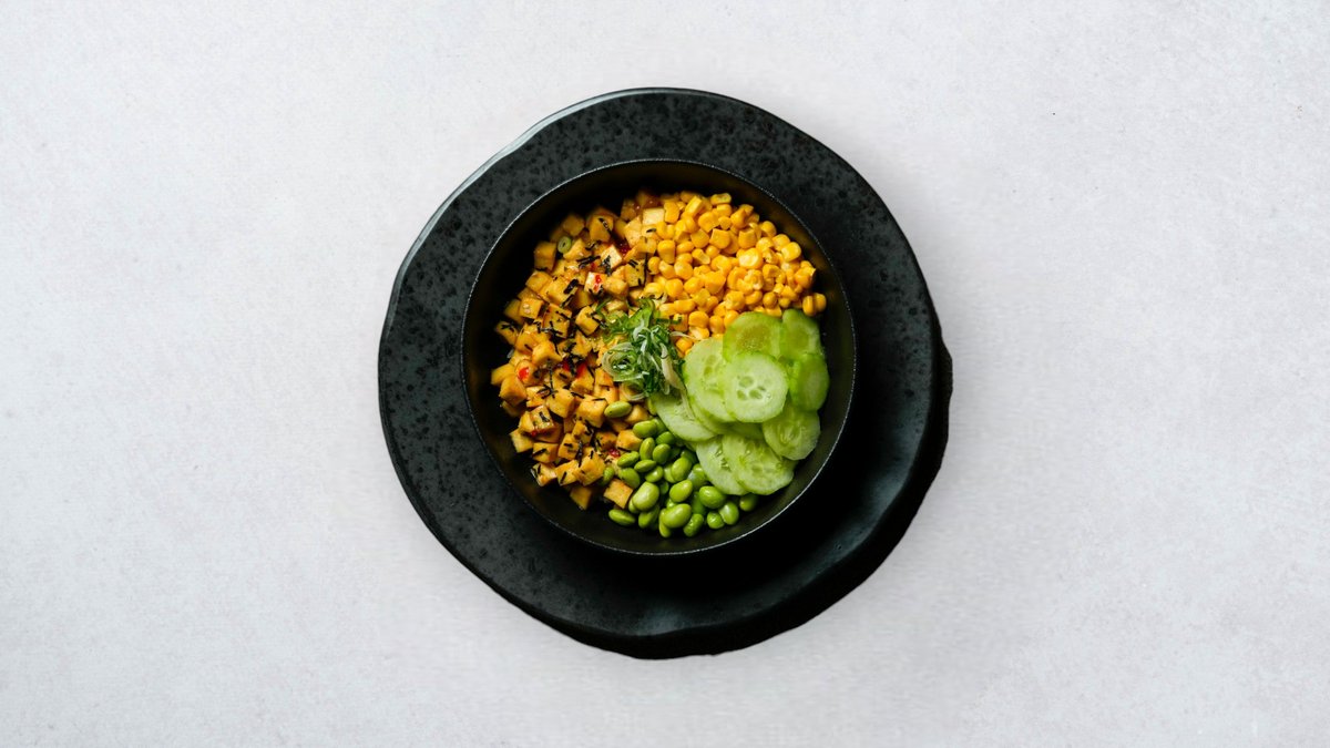 Riža, dimljeni tofu u sweet chilli umaku, svježi krastavac, edamame, kukuruz šećerac, furikake