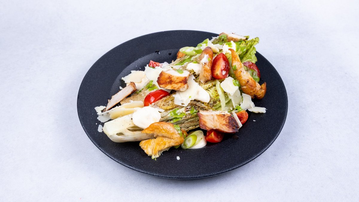 Zelena salata, komadići pilećih prsa, Grana Padano sir, hrskavi krutoni i preljev od češnjaka