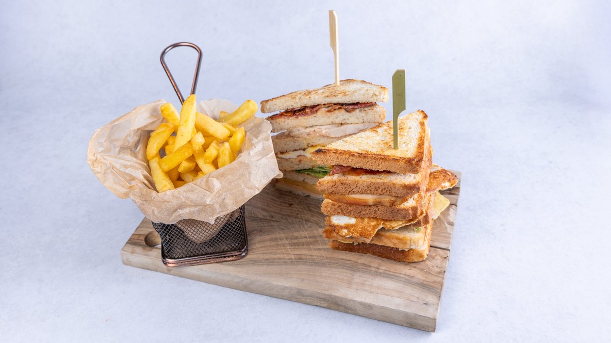 Sendvič s komadima piletine, hrskavom slaninom, salatom, majonezom, jajem, sirom i pommes fritesom