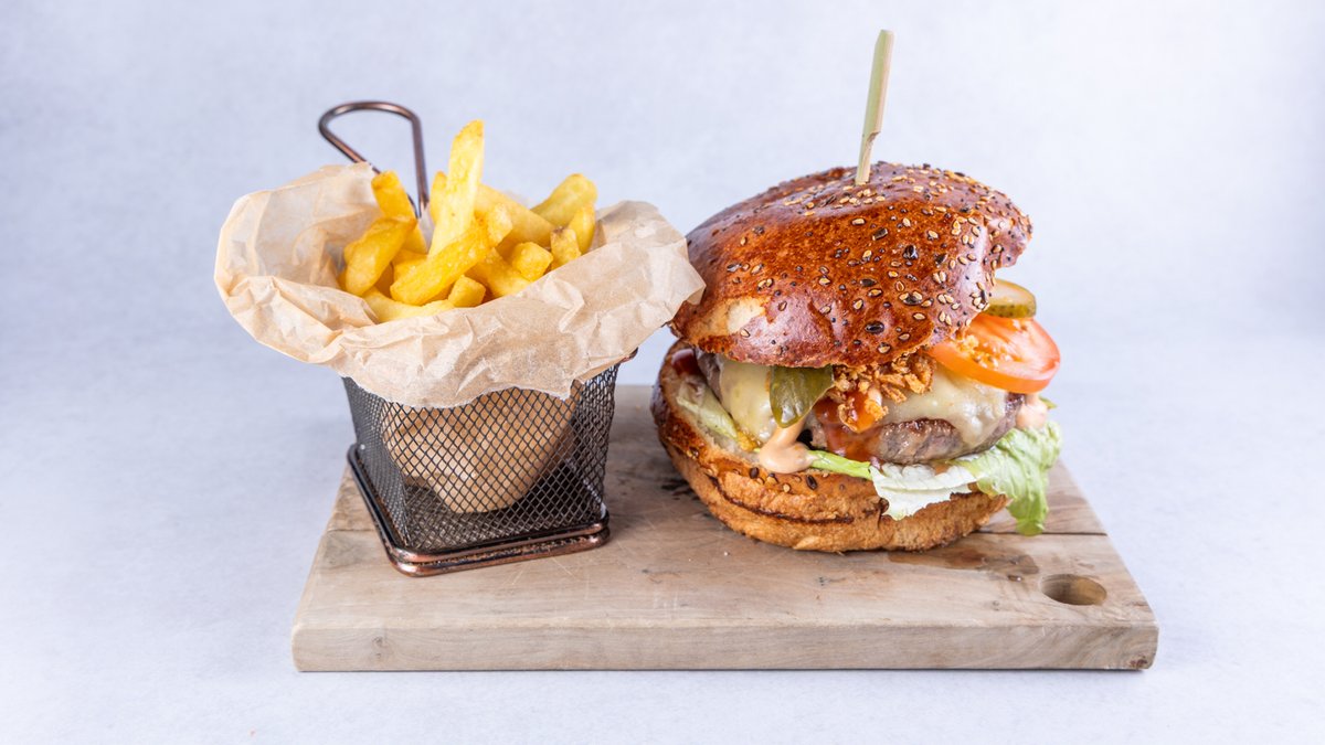 Slasni burger s vrhunskom govedinom, dimljenim sirom, rajčicom, kiselim krastavcima, iceberg salatom, hrskavim lukom i pommes fritesom
