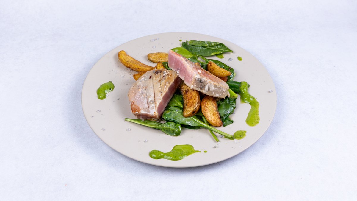Odrezak tune s crnom soli i krumpirom i špinatom