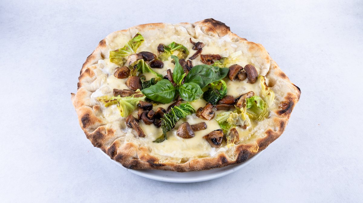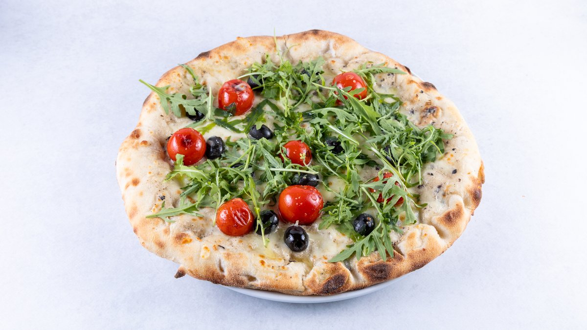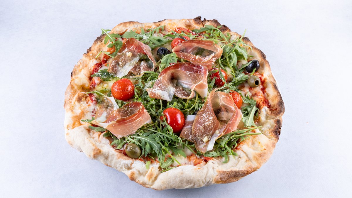 Umak od rajčice, mozzarella, pršut, rikula, pesto genovese, marinirana cherry rajčica, parmezan, masline