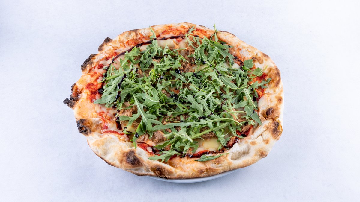 Umak od rajčice, mozzarella, tuna,sir, bosiljak,rikula, balsamico umak