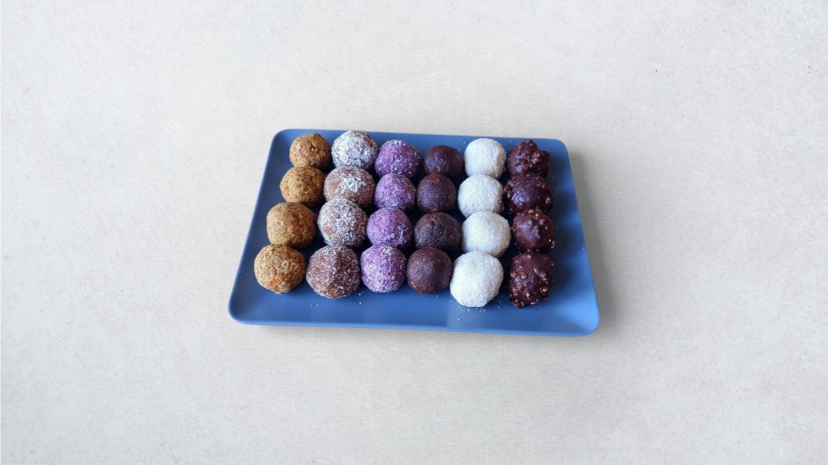 Badem, kokos vrhnje, kokos ulje, agavin slad, kakao, vanilija ekstrakt, svježe datulje, kokos, indijski oraščići