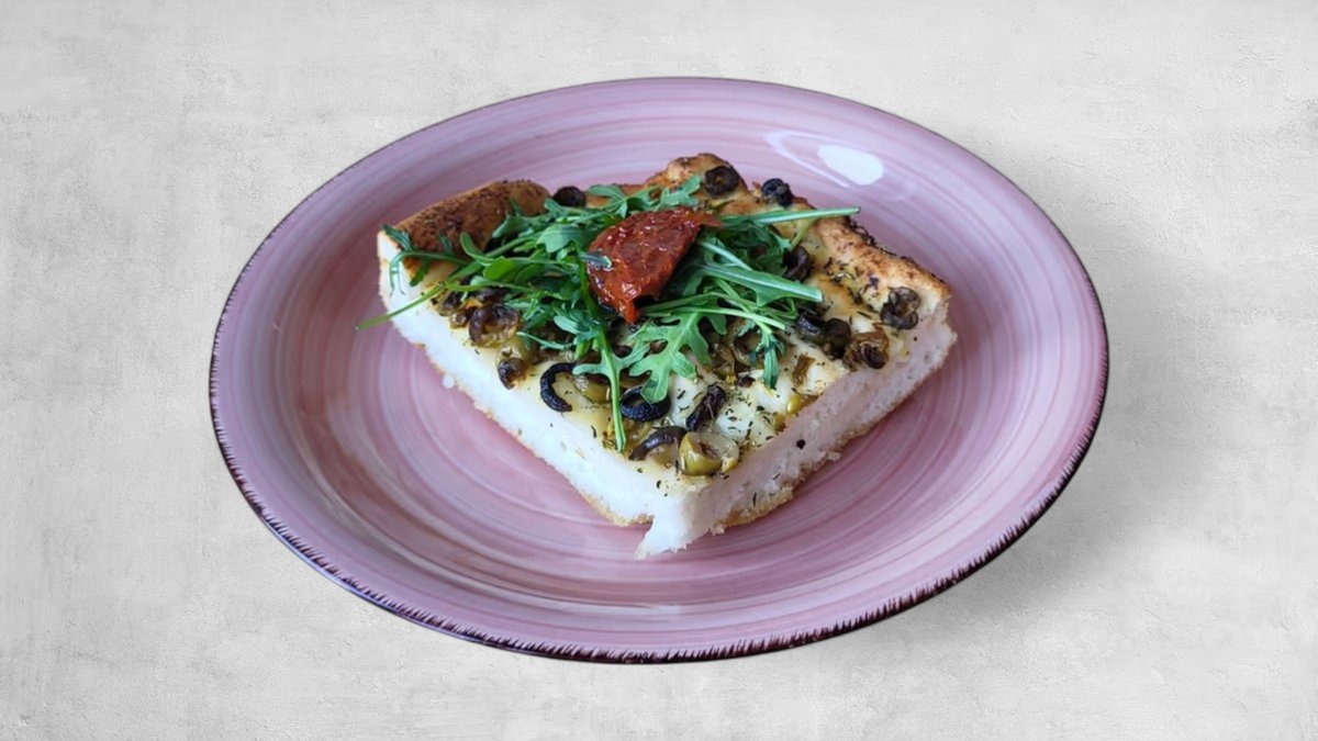 Tijesto od rižinog brašna, kukuruznog škroba, bogat dijetalnim vlaknima, sol, voda i kvasac, sa sušenim rajčicama, kaparima, maslinama i začinima *vegan *low gluten