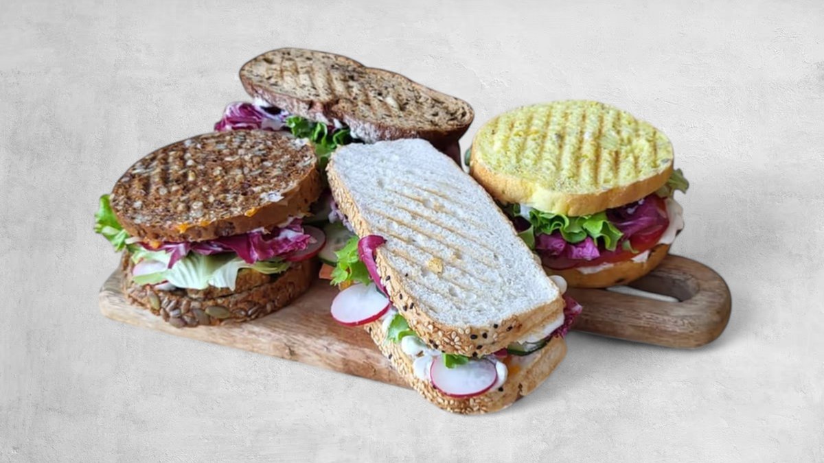 Kruh od bezglutenske mješavine s dimljenim tofom, svježim povrćem, veganskim sirom i majonezom * izberite sami vrstu kruha, punjenje je isto za sve *** Slika je simbolična i prikazuje naše sendviče
