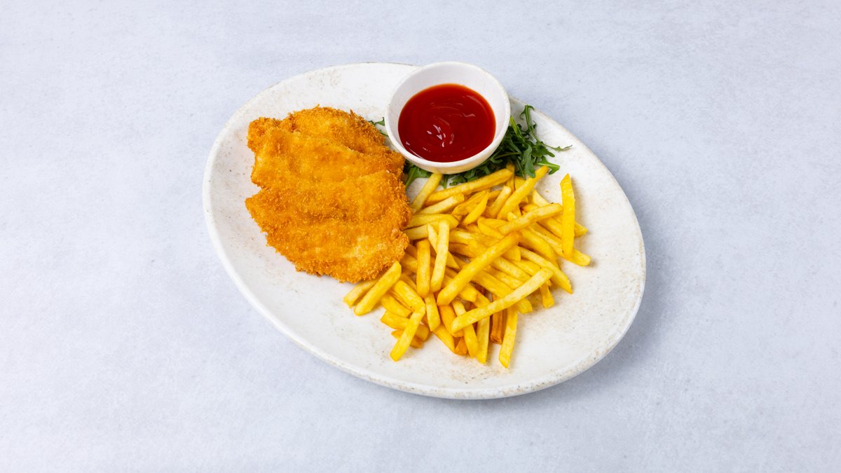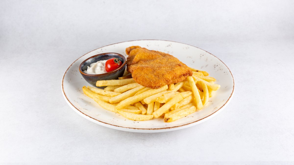 Zagrebački odrezak s krumpirićima u vrhnju i dressing