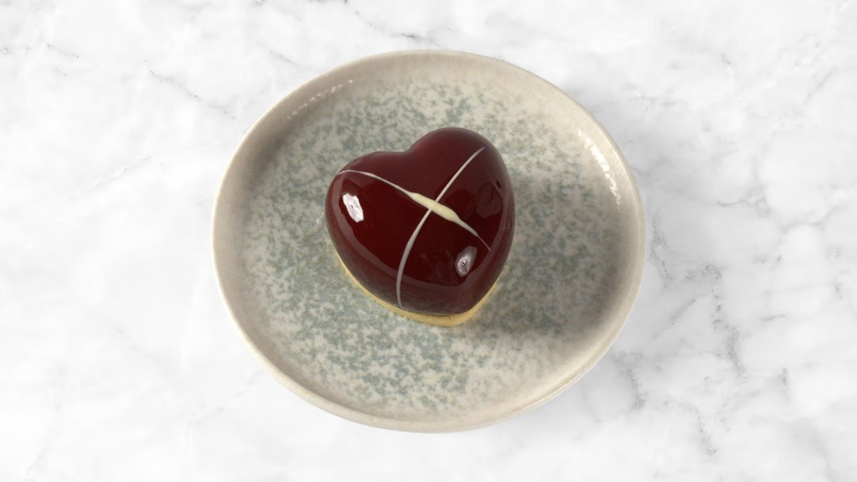 (Malina/karamela) – gel od maline, mousse od Dulcey Valhrona čokolade, karamel mirror glazura, hrskava podloga od badema, malina Inspiration Valhrona čokolada