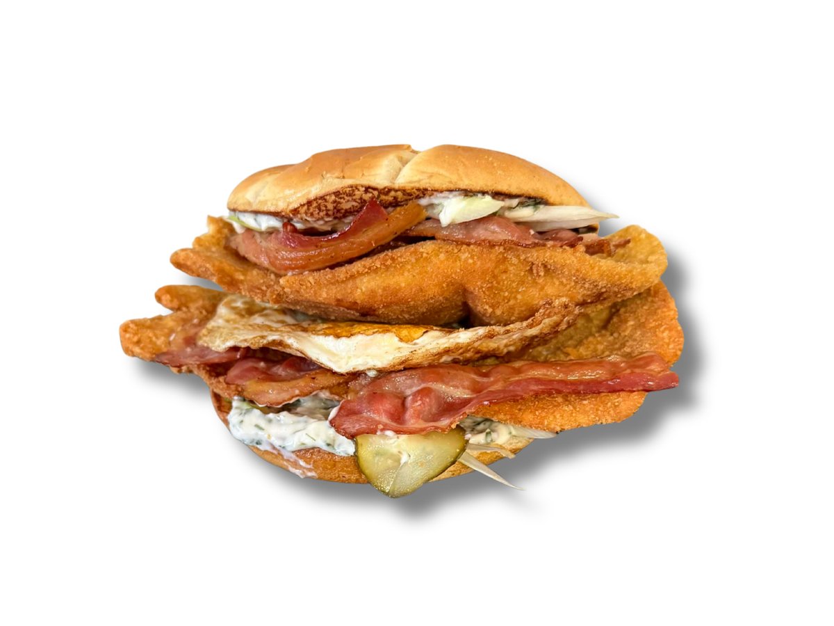 Burgonyás buci, bundázott csirkemell, tükörtojás, jalapeno, bacon, csípős szósz