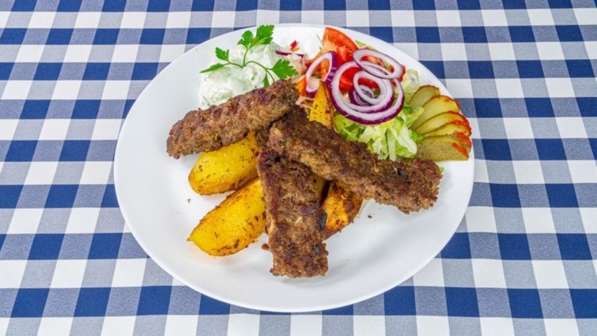 fűszerezett darált bárányhús lávakövön sütve, sült burgonyával, friss salátával