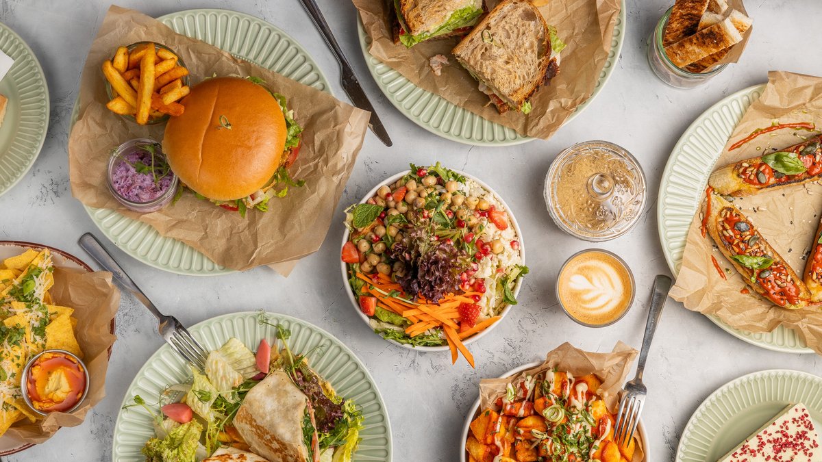 Gluténmentes, vegán és vegetáriánus szendvicsek, sütemények, és saláták.