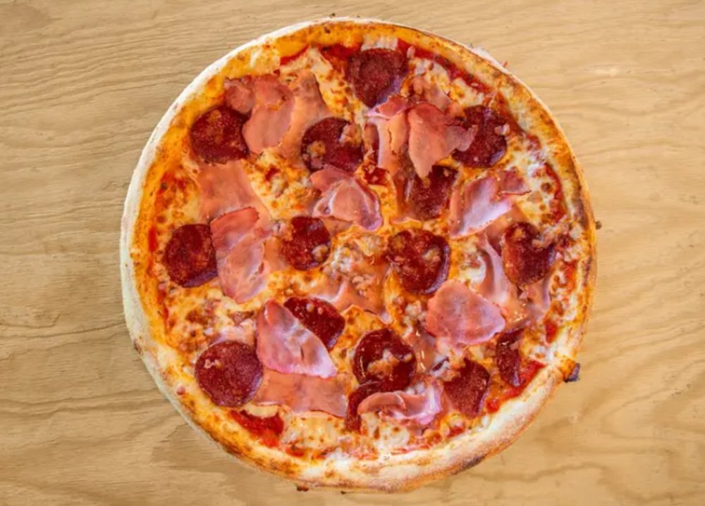 paradicsomszósz, cotto sonka, bacon, szalámi, mozzarella
