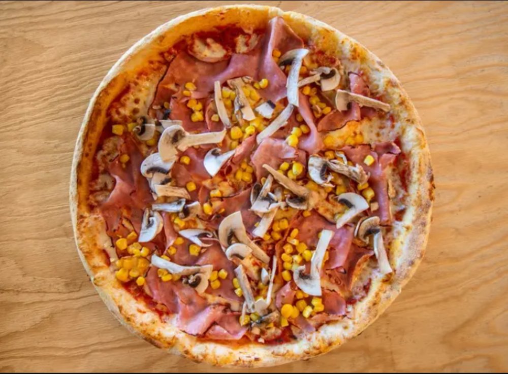 paradicsomszósz, cotto sonka, gomba, kukorica, mozzarella