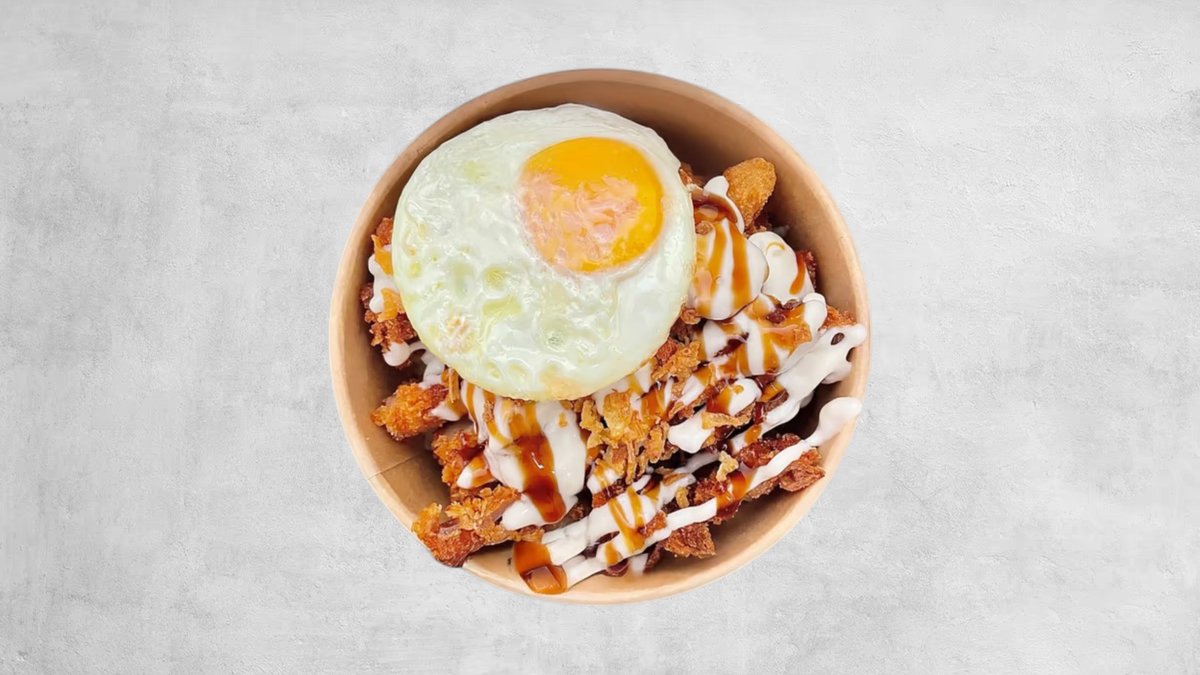 rizs, rántott csirke csíkok, tükörtojás, majonéz, teriyaki szósz, pirított hagyma