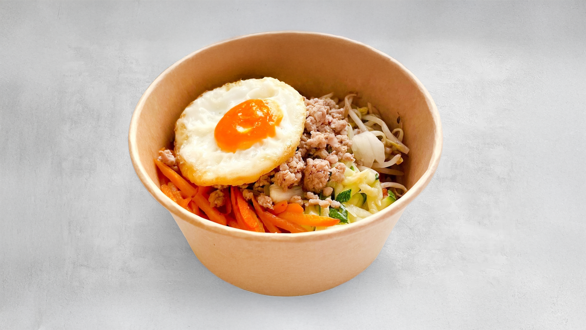 Vegetáriánus Bibimbap - Ízletes rizzsel, hagymával, répával, cukkinivel, gombával, csípős babpaszta szósszal és csírázott mungó babbal. F