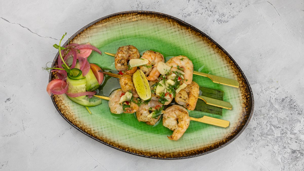 Grillezett garnélarák nyárson (180 gramm), hagymás és chili szósszal