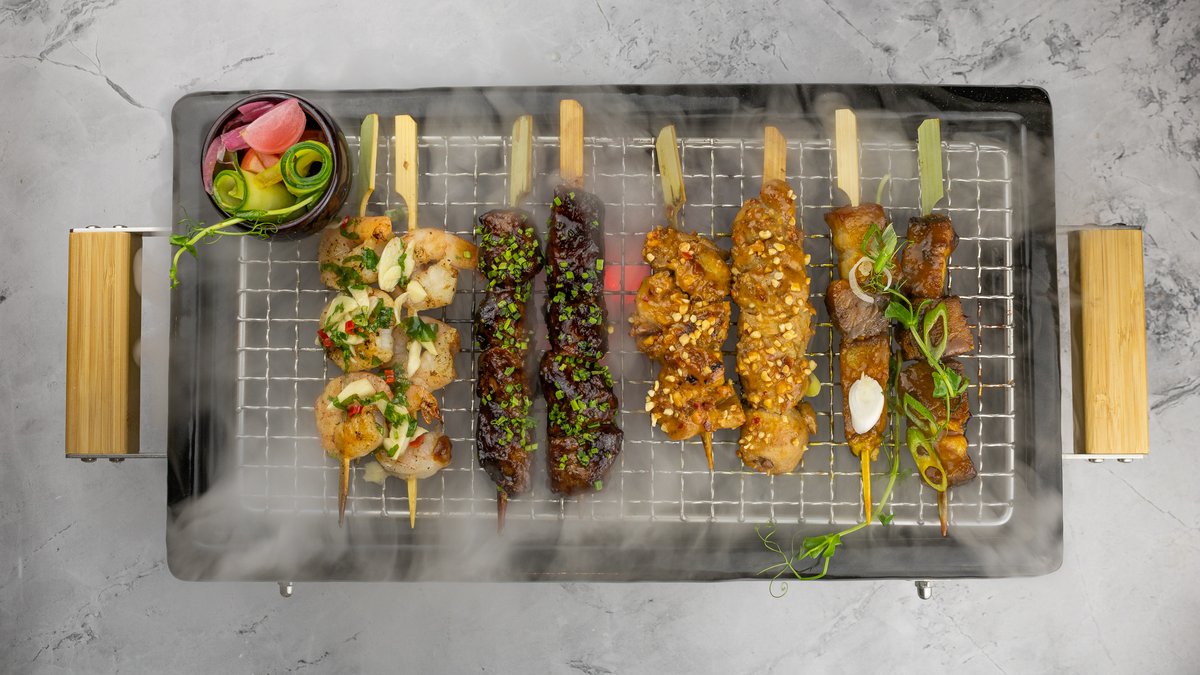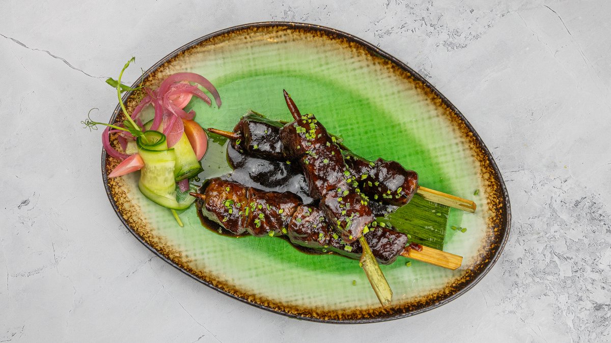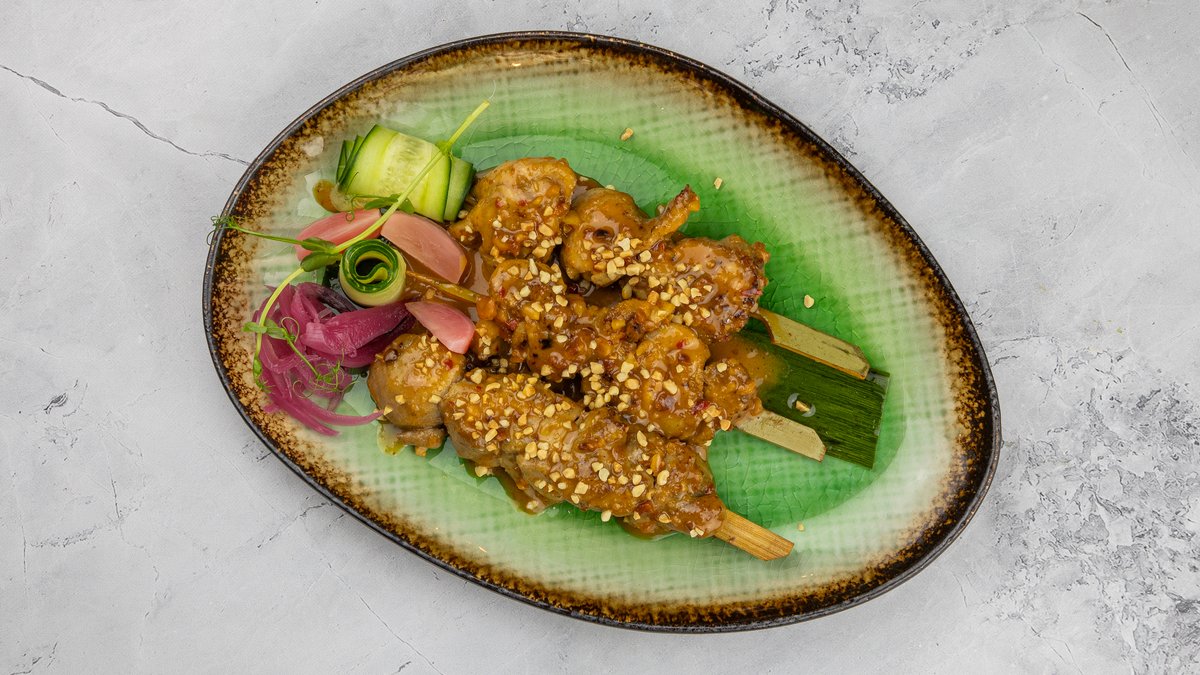 Grillezett csirkecomb nyárson (180 gramm), mogyorós szaté szósszal és savanyított zöldséggel tálalva