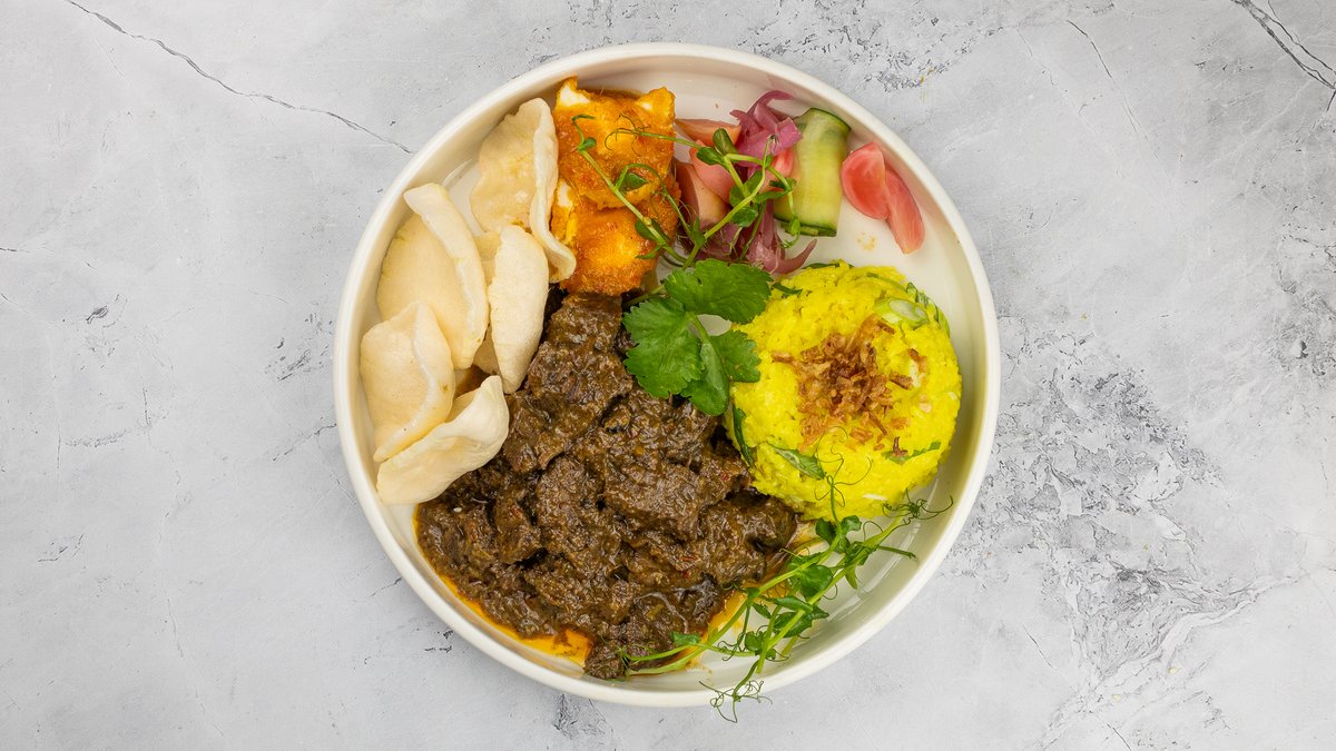 A Rendang lassan főzött marhahúsból készül kókusztejjel és fűszerkeverékkel, csípős szószba mártott főtt tojással és savanyított zöldséggel tálalva