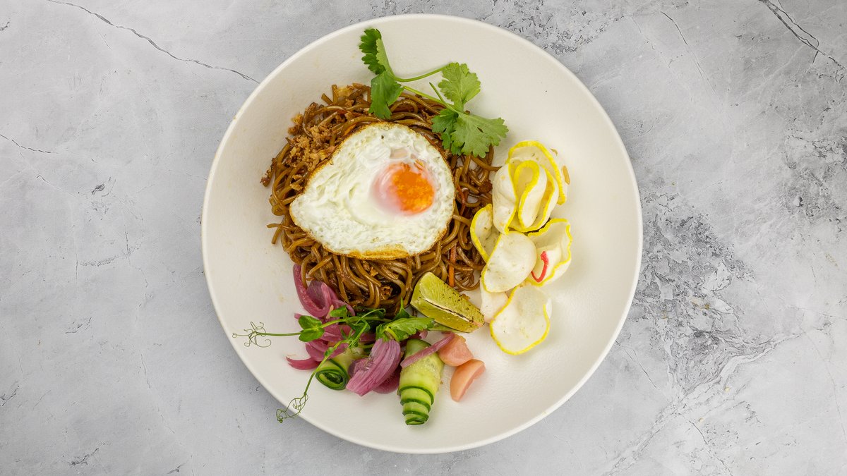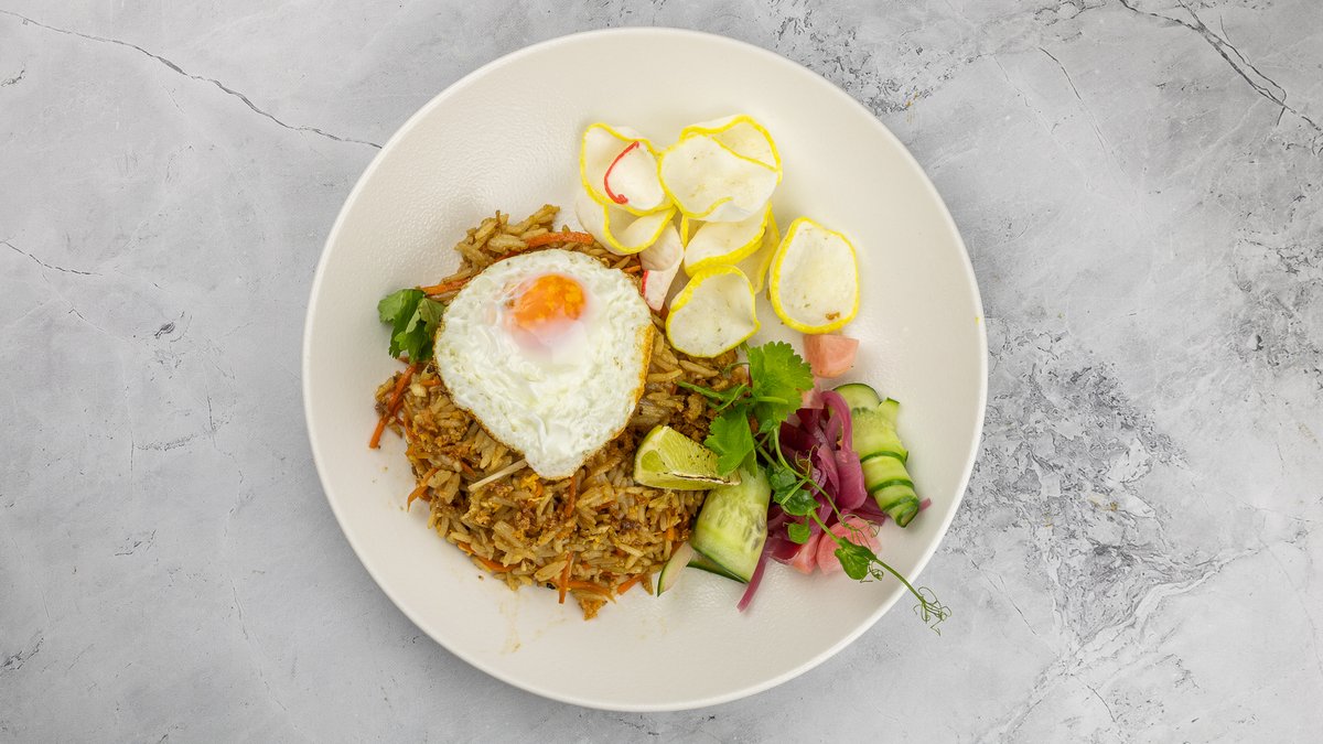 Sült rizs, különféle zöldségekkel tökéletesre pirítva, tükörtojással a tetején tálalva