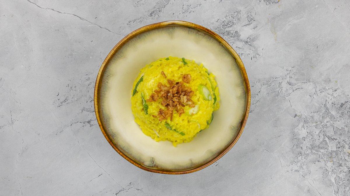 Főtt jázminrizs kurkumával, amely jellegzetes sárga árnyalattal színesíti meg