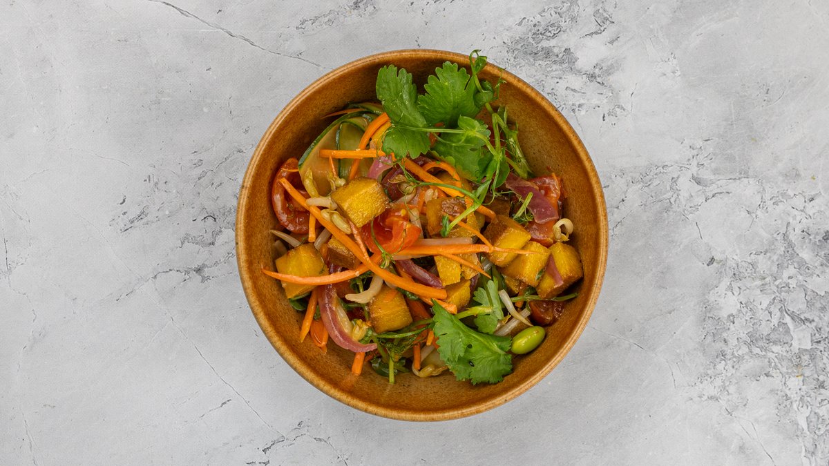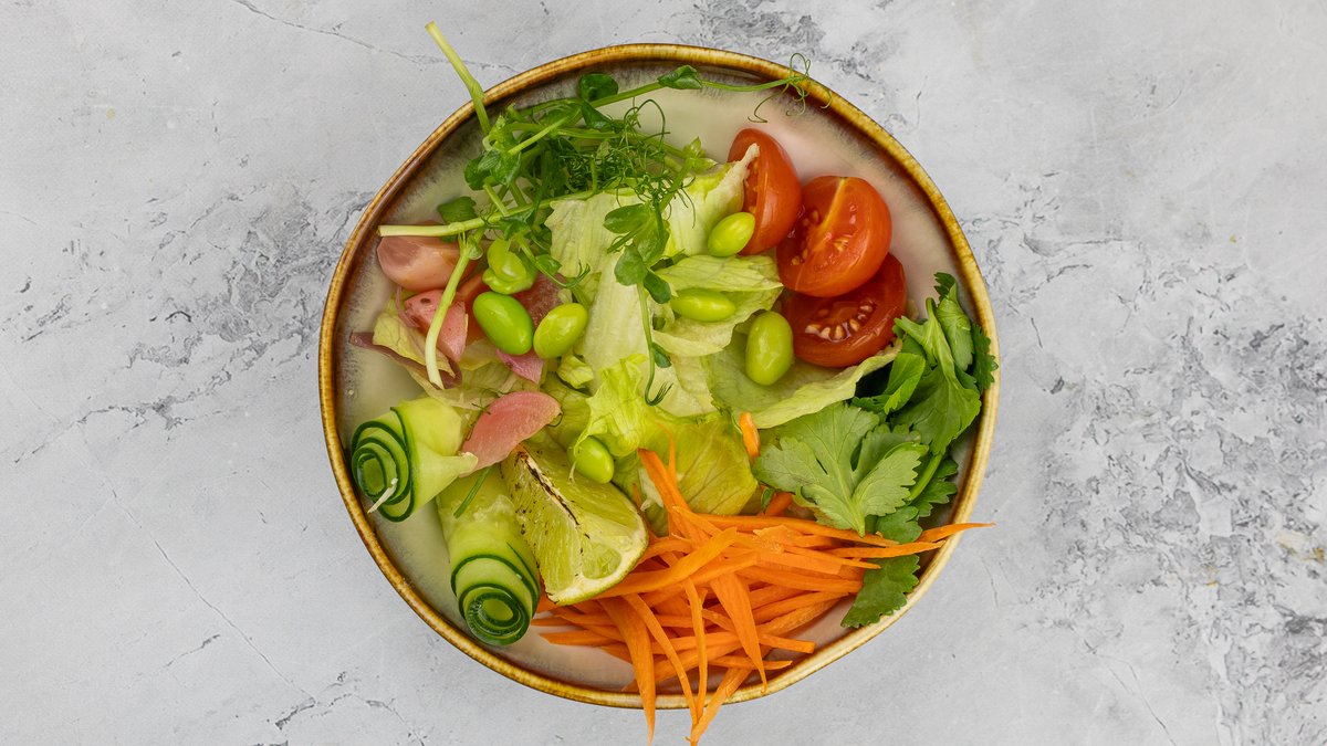 Frissítő saláta keverék jégsalátából, sárgarépából, babcsírából, koktélparadicsomból, uborkából, sült tofuból, edamame babból, főtt tojással és mogyoró szósszal