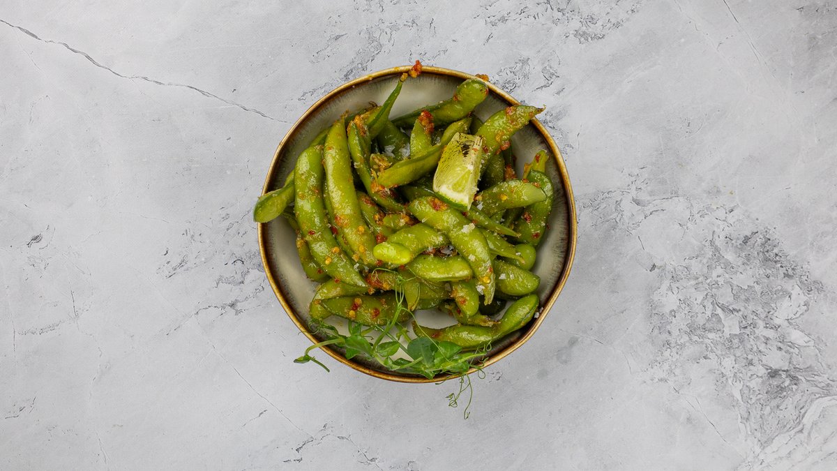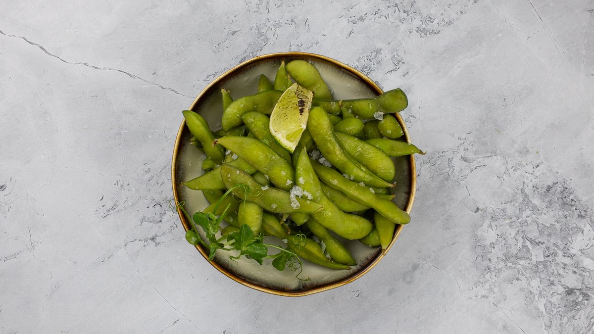 Frissítő saláta keverék jégsalátából, sárgarépából, babcsírából, koktélparadicsomból, uborkából, sült tofuból, edamame babból, főtt tojással és mogyoró szósszal