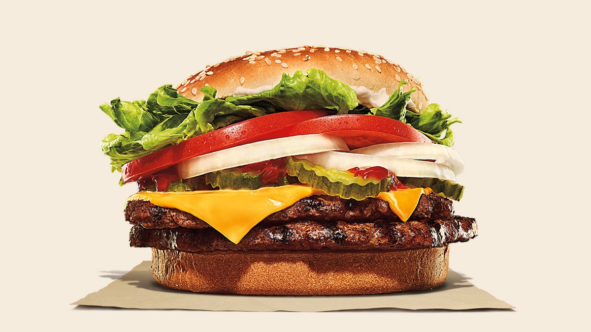 Két tűzön grillezett marhahús szelet, friss paradicsom karikák, hagyma, uborka, ropogós jégsaláta, lágy majonéz és ketchup, pirított, szezámmagos zsemlében. Ez a dupla WHOPPER®! Allergének: glutén, mustár, tojás, zeller, szezámmag