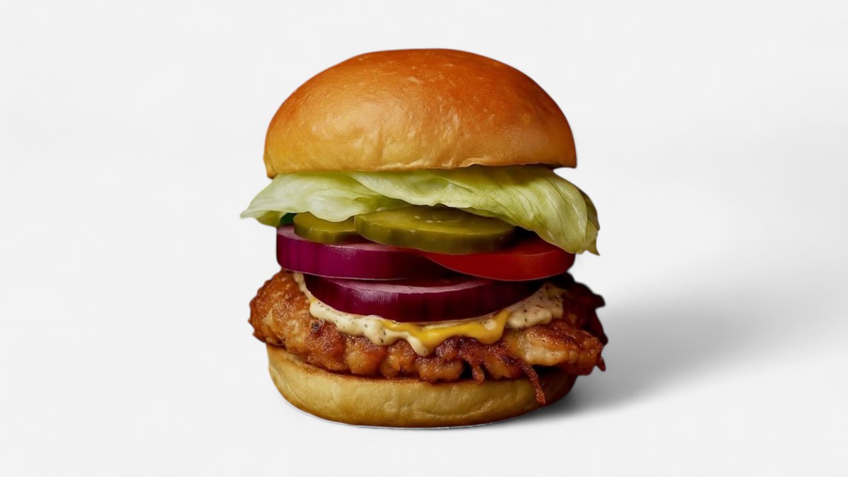 125g rántott csirkemell, füstös majonéz, cheddar sajt, crispy bacon, jégsaláta, paradicsom, hagymakarika