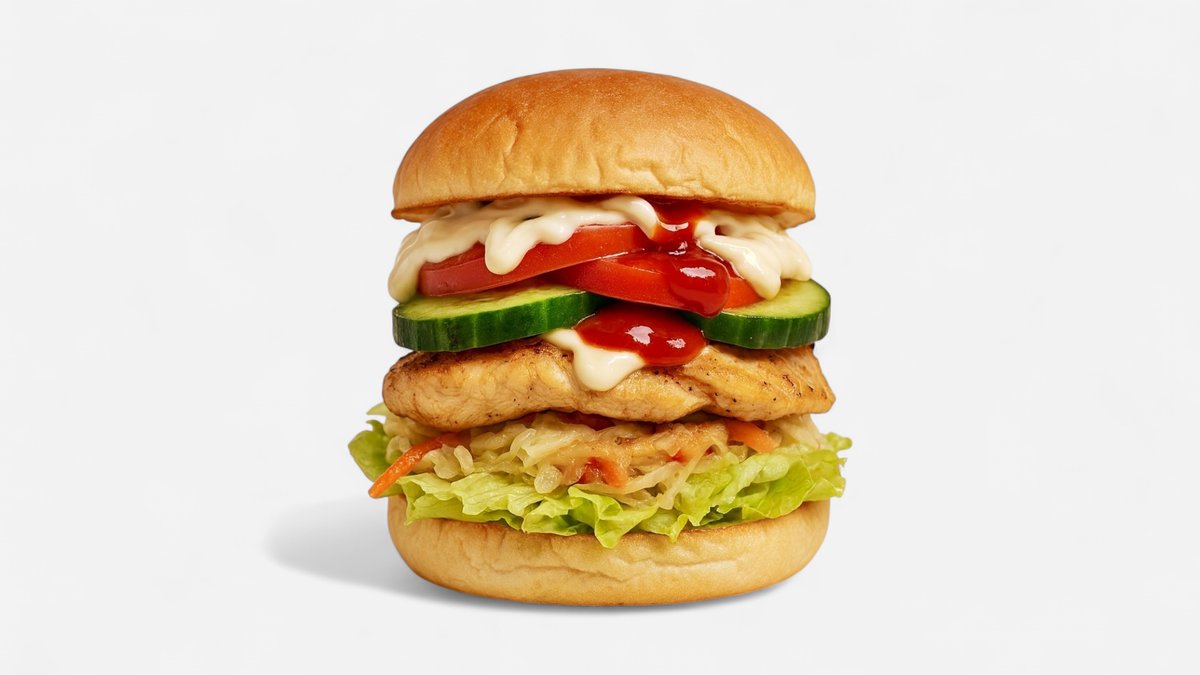 grillezett csirkemell - ketchup - mustár - csalamádé - lila hagyma - kígyó uborka - paradicsom - jégsaláta /Tejmentes/