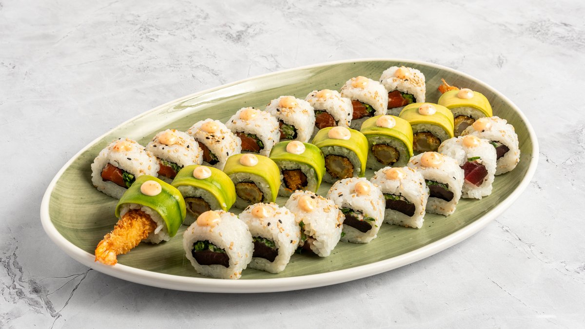NIGIRI: lazac (2db), rák (2db), tojásomlett (2db), süllő (2db) salmon (2pcs), shrimp (2pcs), omelett (2pcs), sea bass (2pcs) MAKI: avokádó tekercs (6db) lazacos tekercs (6db) uborkás, sajtkrémes tekercs, tonhallal borítva (4db) tonhal, uborka, kalifornia paprika tempurázott tekerecs majonézzel (8db) avocado roll (6pcs) salmon roll (6pcs) cucumber and cream cheese roll, wrapped with tuna (4pcs) tuna, cucumber, bell pepper tempura roll, with mayo (8pcs)