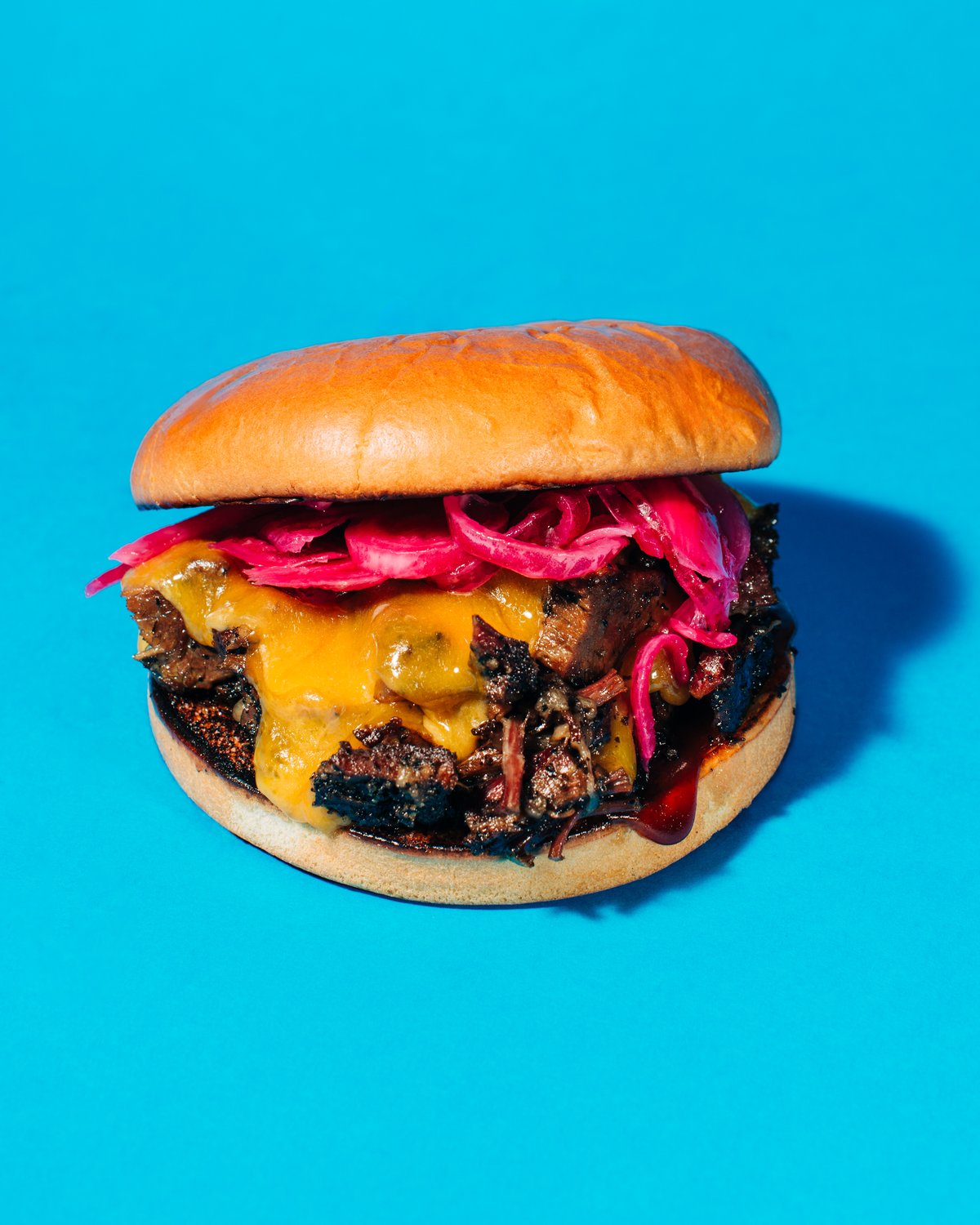 brioche bun, BBQ chopped beef, BBQ sauce, cheddar, pickled onion