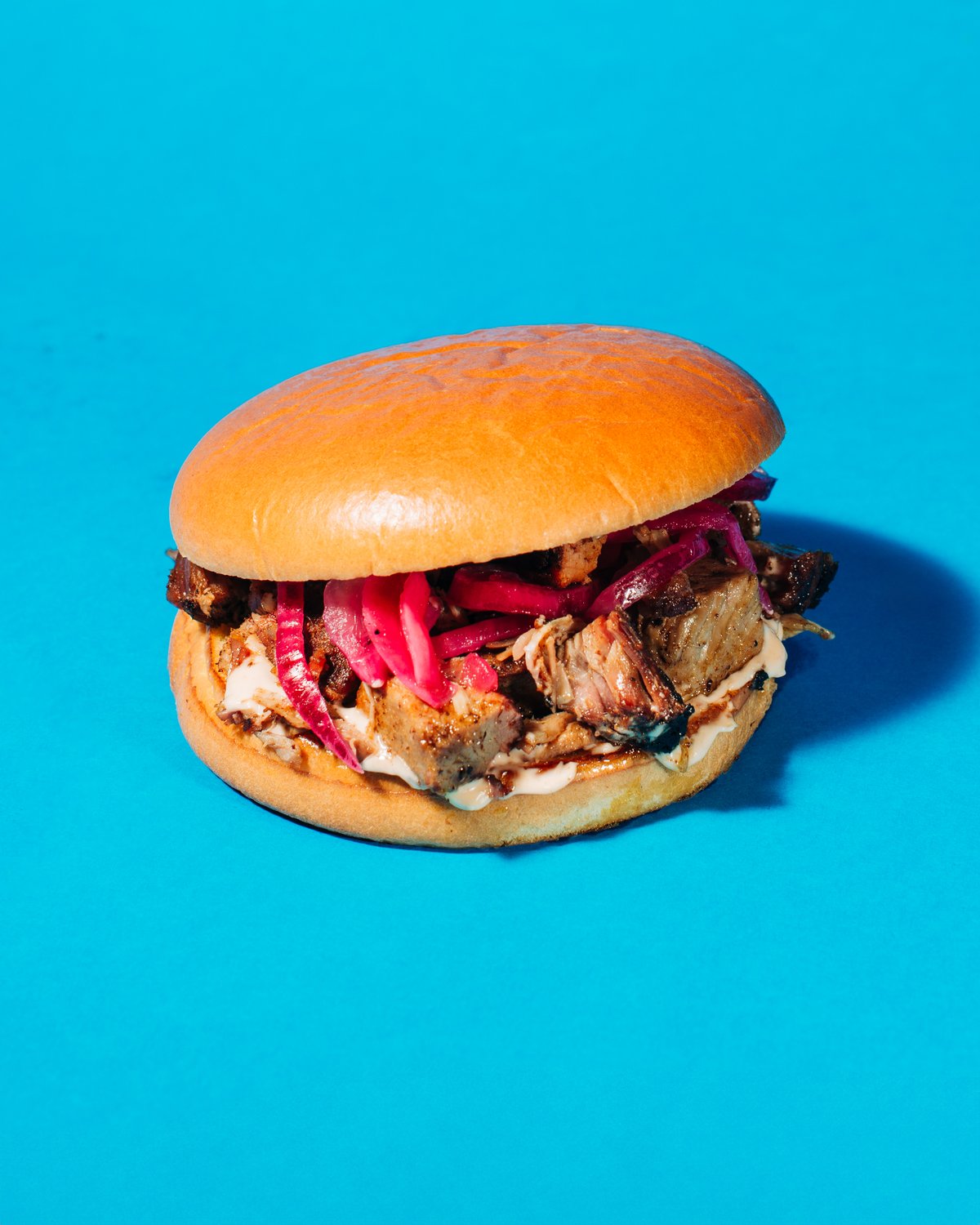brioche bun, BBQ chopped pork, chipotle mayo, pickled onion