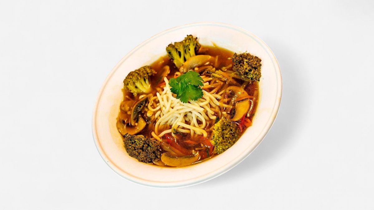 A warm, comforting Himalayan noodle soup made with a flavorful vegetable broth, tender noodles, and a mix of fresh vegetables like broccoli and mushrooms, which add a hearty texture and earthy taste to the dish.