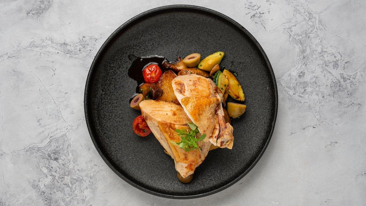 roston sült csirkemell, parázsburgonya, csiperke, koktélparadicsom, oliva, jus