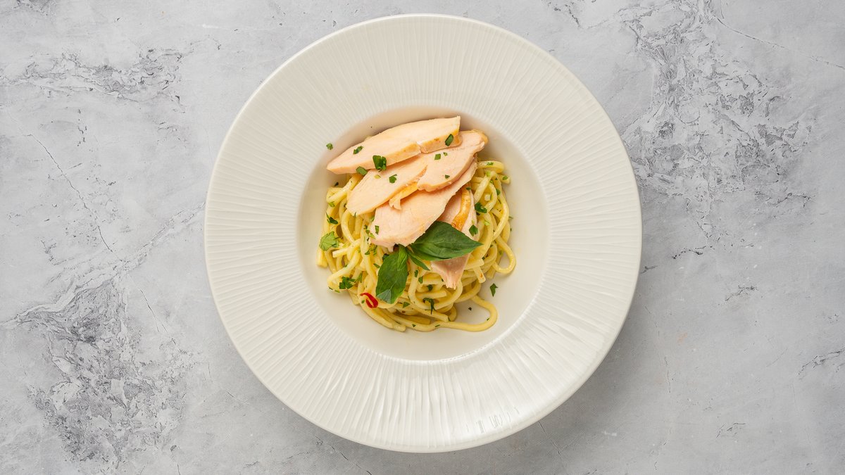 aglio olio spagetti grillezett csirkemellszeletekkel