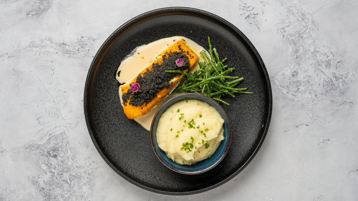 kapros lazacfilé lime mártással, füstölt burgonyapürével, tengeri spárgával, lazacbőr crustával