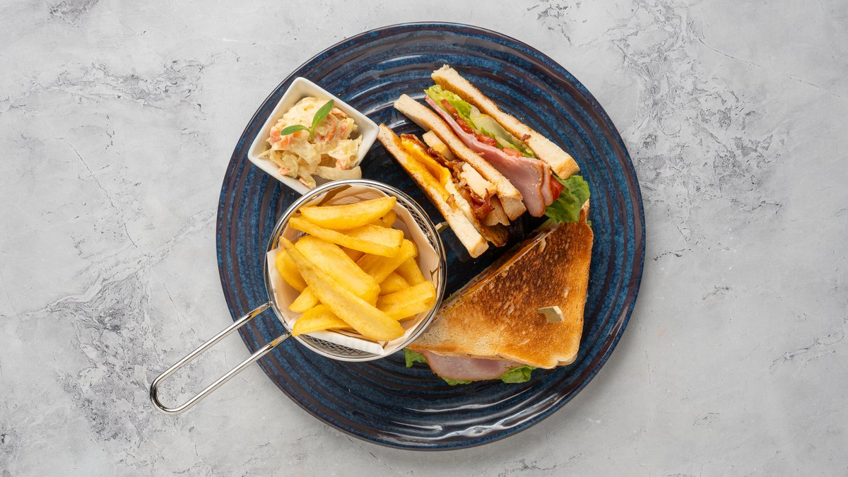 toast, csirke, tükörtojás, bacon, majonéz, jégsaláta, paradicsom, házi sültburgonya, coleslaw