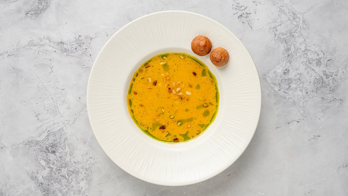 Kakukkfüves zöldségkrémleves salotta chipssel, zöldolajjal